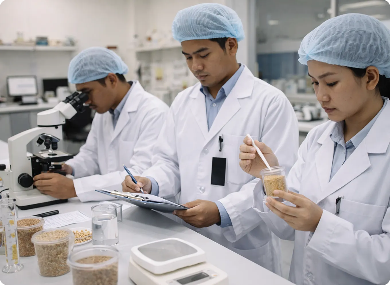 Pengujian Fisik (misalnya komposisi campuran, berat uji, dan deteksi benda asing)